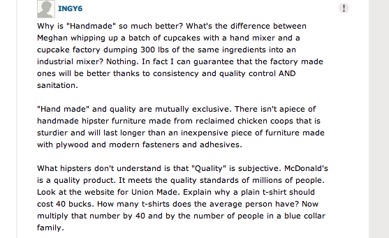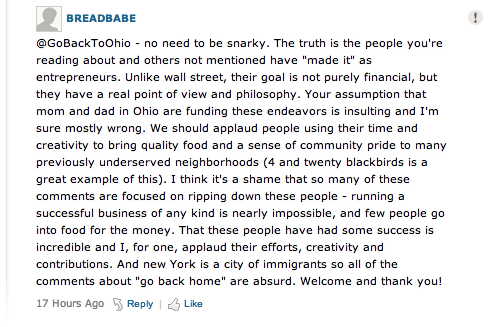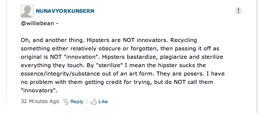 We had our own brief discussion about whether or not Brooklyn is becoming too twee, but we weren’t the only ones. Over at New York Magazine, the commenters had their own rage issues to work out about hipsters and transplants. To be fair, they were able to stay on topic without veering off into whether or not B. Hussein Obama was actually born here, something you don’t see in the comments section of YouTube, the Post or even the Wall Street Journal, apparently. Hell, some of the comments were even in defense of the foodies. Presented below are some favorites.